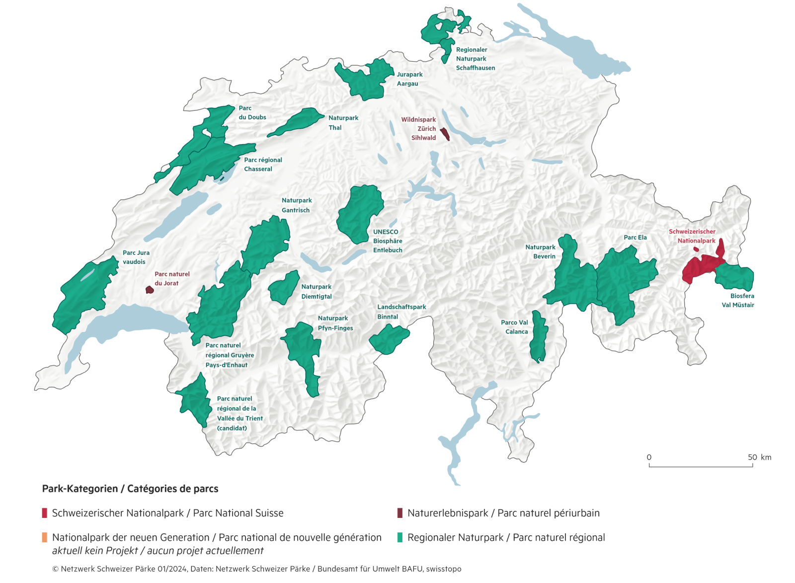 Il existe 4 catégories de parcs suisses, auxquelles correspondent des responsabilités et des objectifs précis. L'office fédéral de l'environnement (OFEV) est l'institution en charge des parcs d'importance nationale.